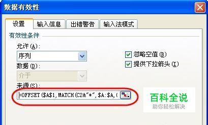 利用数据有效性生成下拉菜单 这个过程主要是利用数据的有效性来生成下拉菜单。首先,我们选中需要设置下拉菜单的单元格,然后选择“数据→有效性”,在弹出的“数据有效性”对话框中,选择“设置”选项卡,在“有效性条件”的“允许”处选择“序列”,并且在“来源”中使用以下公式:=OFFSET($A$1,MATCH(C2&”*”,$A:$A,0)-1,,COUNTIF($A:$A,C2&”*”)) 其中,其中A列是之前排过序的项目数据源所在列,C2 则是当前选中的单元格。