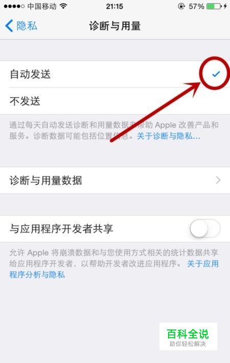 点击手机右下角的“设置”。下拉页面,然后点击隐私。下拉页面至底端,点击“诊断与用量”。