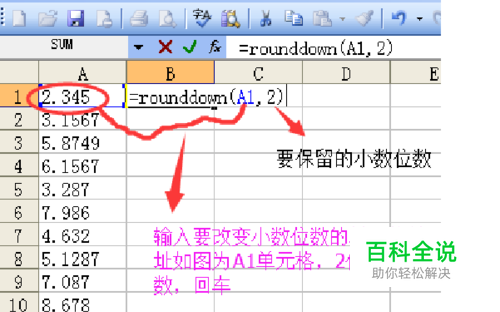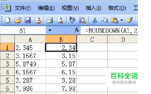 去尾法:运用函数ROUNDDOWN(A1,2),A1表示要改变的数值的单元格地址,2表示要保留的小数位数。如图所示。