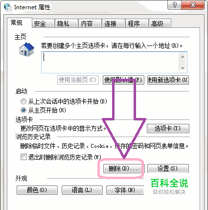 点击”Internet选项“,打开Internet属性窗口,在常规选项下的选项卡中可以看到”删除“