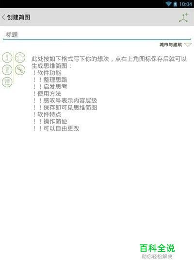 创建思维简图 打开侧栏菜单,点击“创建简图”,即可进入创建页面。你可以用不同数量的感叹号来表示后面的文字在树状图中属于第几级,界面左侧提供了快速录入感叹号的按钮,可以快速录入1-3个感叹号。如果你需要录入更多感叹号,可以手工直接录入四个甚至更多感叹号。