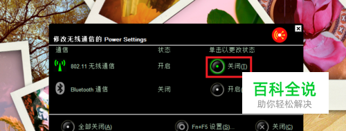 一些品牌机的功能键,如本例中的“Fn+F5”功能键即打开“修改无线通信的Power Setting”界面,点击上面的按钮就能快速开启、关闭无线通信;