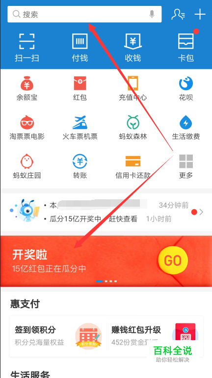 打开手机支付宝,然后在支付宝首界面下面直接点击【开奖啦,15亿红包正在 瓜分】,没有看到,也可以直接点击支付宝上面的搜索框搜索,如下图所示。