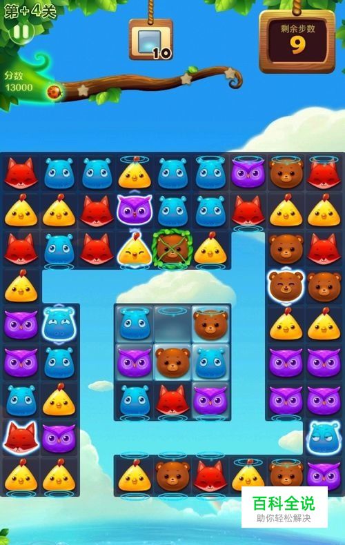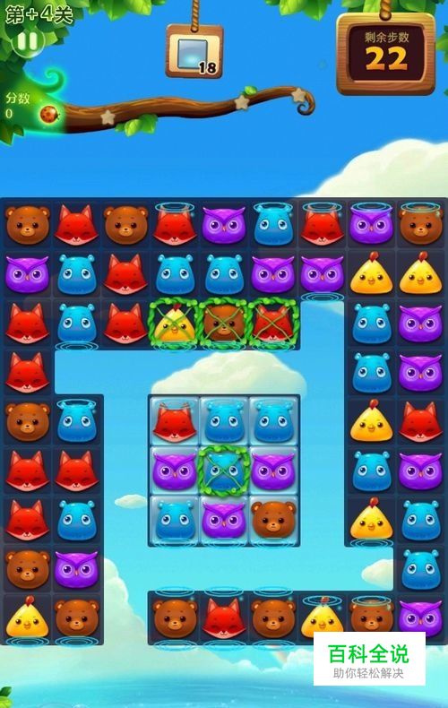 尽快将游戏界面上方被藤蔓束缚的小动物解救出来。