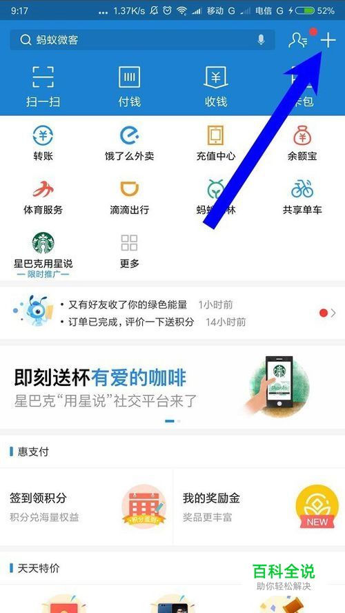 进入到支付宝的主界面之后,我们点击右上角的小加号,打开更多功能,如下图所示,