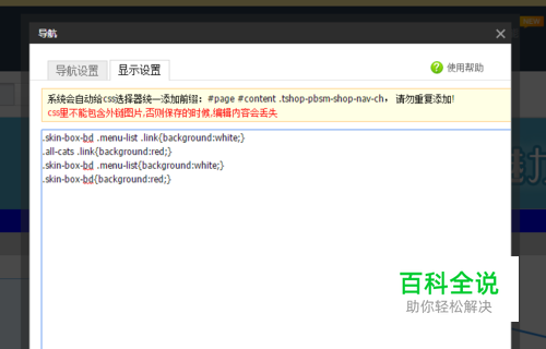 静态背景颜色 代码:.skin-box-bd .menu-list .link{background:white;} 用来设置【首页 】等其它导航类目中的背景色。颜色代码可以用英文单词表示,如white(白),也可以用十六进制表示,如白色为#ffffff等表示。另外背景色也可用图片,代码为{background:url(图片地址);}。 在默认的导航条中最左边的一项为【 所有分类】的背景色 代码:.all-cats .link{background:red;} 导航条整个分类段背景色 代码:.skin-box-bd .menu-list{background:white;} 【导航条背景色】修补导航右侧缺口(分类不多时,右侧可能会空着时的缺口) 代码:.skin-box-bd{background:red;} 我这个颜色用的很丑,主要是为了好区分,哈哈。