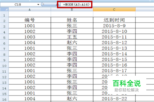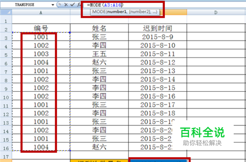 选中要出现结果的单元格,即“迟到次数最多”右边的单元格,输入函数MODE,并选中要统计的单元格范围,即变成了“=MODE(A3:A16)”,然后回车。