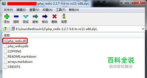 下载完成后,双击打开php_redis-2.2.7-5.6-ts-vc11-x86.zip文件。其中的php_redis.dll正是我们需要使用的php扩展。