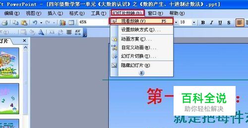 按Ctrl键不放,单击菜单中的“幻灯片放映”,选择“观看放映”,如下图。
