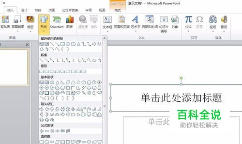 打开PPT软件以后先新建立一个标题的版式页面,现在呢我们可以把输入标题的地方设置一直美观好看的标题框,把鼠标移动到标题里面,点击插入,在插入的里面找到插入形状的选项。