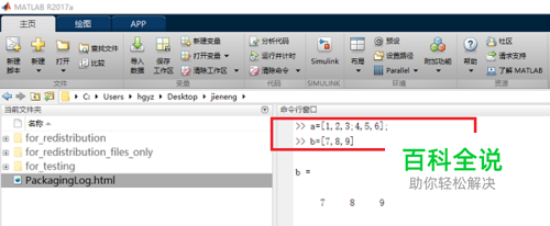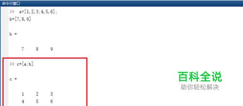 第二步对于同列不同行的两个矩阵,我们可以通过c=[a;b],进行拼接矩阵,分号是纵向拼接矩阵,如下图所示: