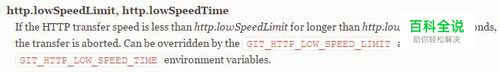 配置git的最低速度和最低速度时间: git config --global http.lowSpeedLimit 0 git config --global http.lowSpeedTime 999999 单位 秒 --global配置对当前用户生效,如果需要对所有用户生效,则用--system 官方文档截图