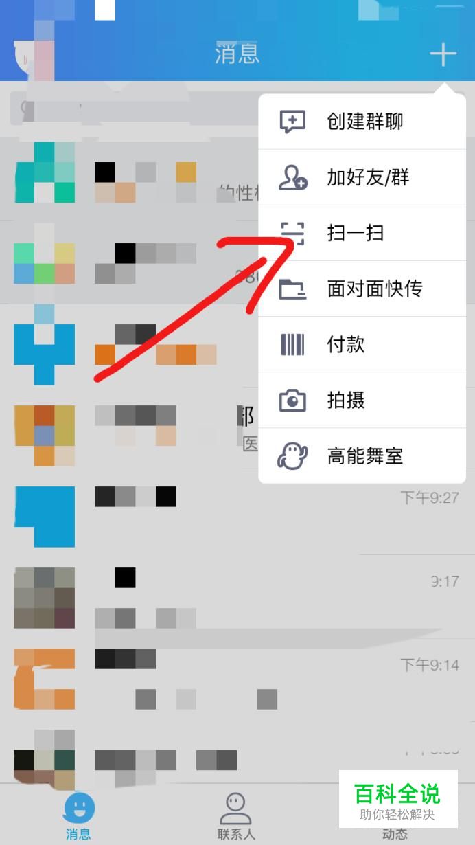 第一步,打开手机QQ,在消息界面,点击右上角的十字符号,找到扫一扫的功能,点开。