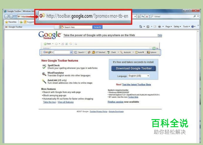 打开IE浏览器。IE浏览器是唯一可以与谷歌工具栏兼容的浏览器。第5版的火狐浏览器及其它新版本的浏览器都不兼容谷歌工具栏,所以你只能在旧版本的火狐浏览器中安装谷歌工具栏。而Chrome浏览器自带谷歌工具栏,所以Chrome的用户可以直接使用工具栏。 如果你使用的是第四版及更老版本的火狐浏览器,你可以根据以下步骤安装谷歌工具栏。但出于安全方面考虑,强烈建议你更新升级你的火狐浏览器版本到最新版本。