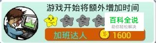 【加班达人】游戏开始将额外增加时间 一级800,目前一级,故事模式起始时间增加7秒,为1:07。 二级以后不知道是否以等差数列累加。 对于故事模式来说,起始时间还是很有用的。毕竟时间就是基础,没有充足的时间对于新手来讲将是很可怕的事情:紧张、着急、点错都将是致命的,多1秒都会有转机的可能,从而顺利过关。这是玩家第一个必点的技能,金币到手果断升级。但是建议只升了一级, 金币储备是原因之一,但是更关键的还要看下面的说明。