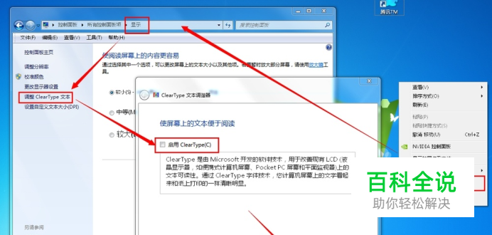关闭ClearType字体 1.返回Windows7桌面,右键->屏幕分辨率 2.地址栏中选择【显示】 3.左侧列表选择【调整ClearType文本】 4.取消【启用ClearType文本】 5.下一步->下一步...->完成