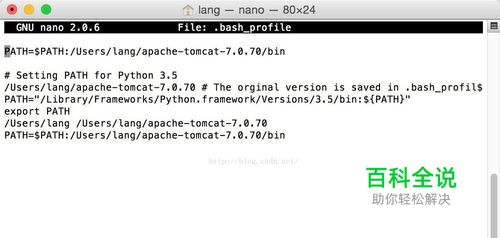第二步: 下载完成后 ,把解压的文件夹放到一个目录下 /Users/lang/下 1.打开你的终端:然后输入 pico .bash_profile 回车 pico 和.bash_profile 之间有空格2. 然后添加你tomcat放入的路径的path,如下图所示:Mac 可以直接拖拽文件夹到bash 里 编辑完后,control+x (保存) 继续 :y (同意) 回车;