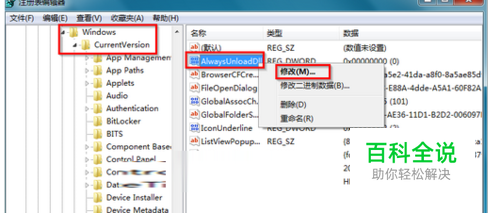 在打开的“注册表编辑器”窗口中,依次找到HKEY_LOCAL_MACHINE\SOFTWARE\Microsoft\Windows\CurrentVersion\explorer,然后点击“explorer”,在右侧窗口,找到并双击“AlwaysUnloadDll”;