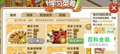 看到[菜谱]点击后出现的学习菜肴,然后查看右边的食材消耗情况。在食材消耗情况下方就是当前菜肴所在出售的全部菜肴了。