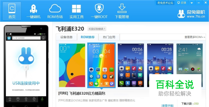 刷机险情手动能进fastboot (DOS),但是连电脑没反应,或者无法连接。 刷机失败解决方法 :打开RSD,拿下电池插上手机,按着返回键加开机键(根据自己的手机品牌,可以搜索该机型进入fastboot的方法),同时装上电池。注意不要松开这三个键,持续3分钟直到连上电脑五,线刷刷机工具上出现Code corrupt。 以上基本就是线刷过程中会出现的几个影响刷机成功的情况,由于安卓手机种类复杂,小编无法逐个介绍。就算抛砖引玉了。 root工具:奇兔刷机 下载安装!安装完毕,立即双击启动软件 飞利浦E320:root 用USB将飞利浦E320连接上奇兔刷机。找到root。点击一键root就可以了哟~还可以移除root