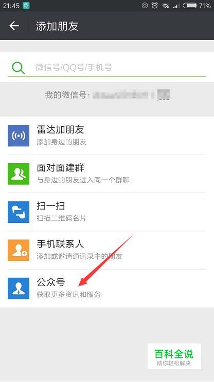 首先打开微信添加好友,选择公众号搜索。