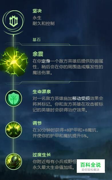 青蛙称号是cd锤石创始人。那么我们来看一下他的符文。首先他的主系符文带的是坚决系, 第一层是余震可增加双抗并造成伤害,