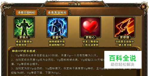 当玩家成功开通VIP成为会员后,VIP图案将被点亮,VIP成长值以10/天增长,累计一定数值,VIP等级将会提升到下一等级;