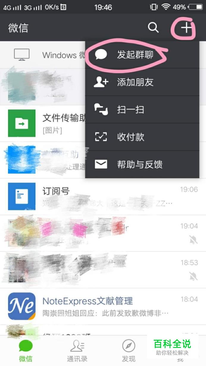 打开微信主页,点击右上方的加号,选择“发起群聊”。