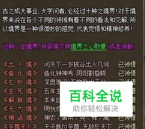 在屠龙传说里,人的精神修养和思想觉悟到达一定的层次之后,就会得到不同的境界之心勋章。游戏中的境界共有十重,分别是出入境、造化境、玄妙境、生死境、 解脱境、无为境、神话境、至尊无上、空前绝后和泰山北斗,这十层境界绝不是虚构出来吓小孩的,都是大有来头、引经据典的。