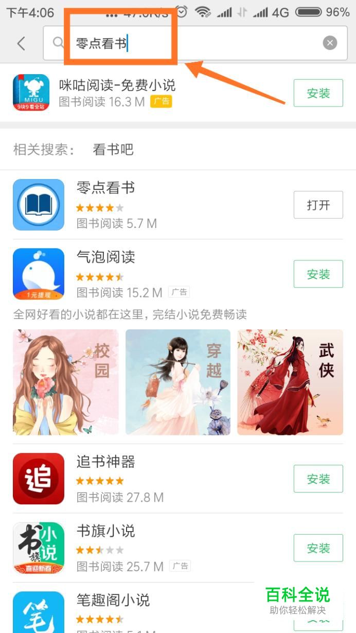 首先我们打开手机的应用商店,点击搜索“零点看书”,下载安装。