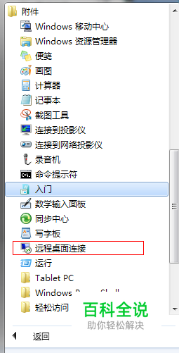 选择 开始菜单 然后单击 所有程序 再单击 附件 最后单击 远程桌面连接,如下图所示: