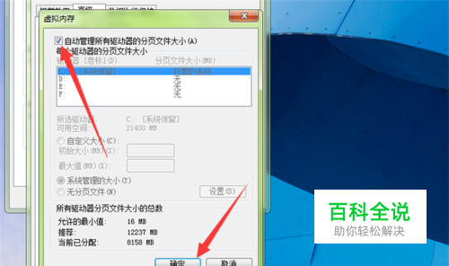当然,你也可以通过点击上方的自动管理驱动器分页文件大小这一内容来自动分配,也是可以的,然后点击确定,之后重启计算机就可以完成设置了。