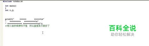 #include <stdio.h> int main() { int i,j; printf(" ****** ******\n" " ********** **********\n" " ************* *************\n"); //前三排的规律性不强 所以直接显示就好了 for(i=0;i<3;i++)//显示中间三排 { for(j=0;j<29;j++) printf("*"); printf("\n"); } for(i=0;i<7;i++)//显示呈递减趋势规律的中间7排 { for(j=0;j<2*(i+1)-1;j++) printf(" "); for(j=0;j<27-i*4;j++) printf("*"); printf("\n"); } for(i=0;i<14;i++)//最后一个星号*与上面的规律脱节了 所以独立显示 printf(" "); printf("*\n"); return 0; }