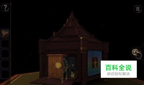 打开弹出箱子部分的上端。 利用重力系统,将四个灯点亮,这时弹出一个图案。 这个图案也就是未上锁的房间标记性图案,相信你也不只拼过一次了. 图案用目镜照射,是一个立体的图形,不断调整位置,使其重合,则弹出一个钥匙孔。