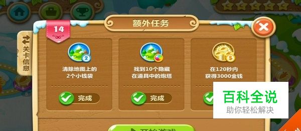 保卫萝卜2第14关攻略 【额外任务】 一、消除地图上的2个小钱袋。 二、找到10个隐藏在道具中的炮塔。 三、在120秒内获得3000金钱。 这是额外任务,要记住哦。 先建造一个太阳塔,清理周边的道具。 道具消灭后,隐藏的太阳塔出现攻击道具。 在建造一个太阳塔,继续清理周边的道具。 卖掉太阳塔,继续清理道具。 再建造一个太阳塔,清理周边的道具。 道具消灭之后,隐藏在道具中的塔出现。 清除所有的道具。 卖掉瓶子和炸弹星塔。 继续卖掉减速风扇塔,清理怪物。