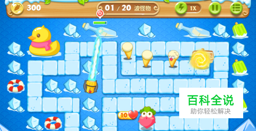 然后在上方放一个多重箭,多重箭打小怪物, 手电筒就专注清理冰块。 有金币后添加一个手电筒,
