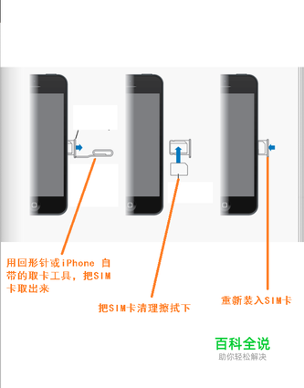 在 iPhone 右侧的 SIM 插槽处有一个圆形小孔,用回形针或 iPhone 自带的取卡工具,把 SIM 卡取出来。然后清洁擦拭一下,再把 SIM 卡装入 iPhone 中,如图所示