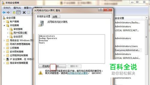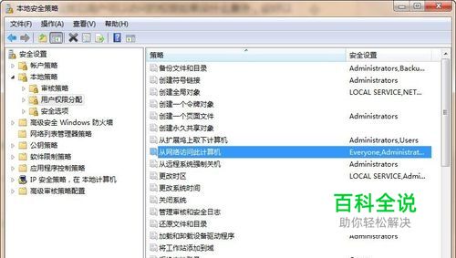 点“用户权限分配”,在右边的策略中找到"从网络访问此计算机" ,打开后把可以访问此计算机的用户或组添加进来