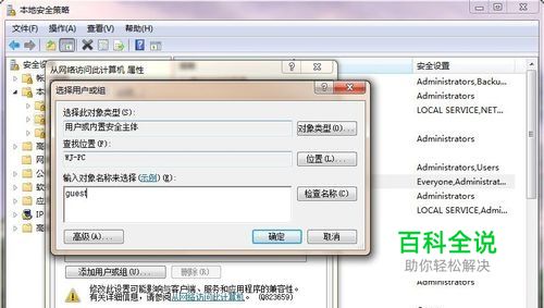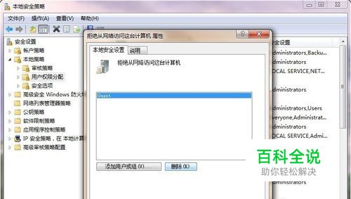 点“用户权限分配”,在右边的策略中找到“拒绝从网络访问这 台计算机”,把guest删除、保存即可。