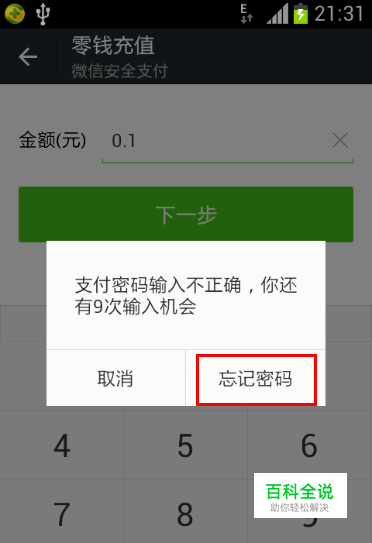 首先你在使用微信支付的时候,微信支付密码输入不正确的时候,看到选中的【忘记密码】点击选中的忘记密码,如图所示