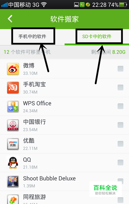 第四,进入软件搬家的页面之后,就能看见手机中的软件和SD卡中的软件, 手机内存不够那肯定是将手机内的软件搬家到SD卡中去。将后面的选项框勾选就够了。