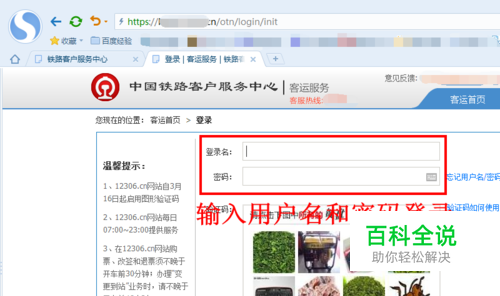 进入登录页面后,输入你的用户名和密码,然后点击“登录”。如果你还没有12306帐户,及时注册。