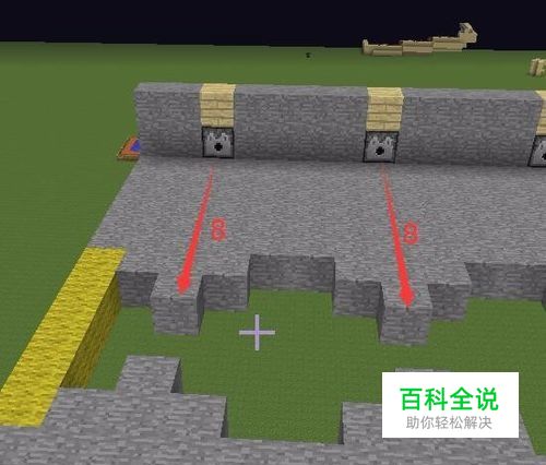 发射器冲着的方向也是放置两格石头,使得发射器到最远距离是8格,然后左右都放置一格。跟之前造第一层一样。