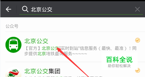 接着输入当地所在城市的公交巴士公众号,然后在搜索结果中点击如图中的公众号。