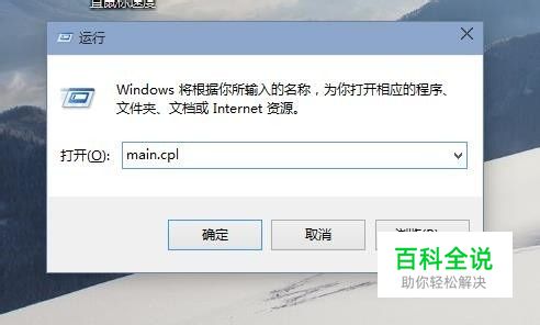 在win10系统桌面,按下WIN键+R快捷键,打开【运行】窗口,输入 main.cpl 然后回车确定。如下图。
