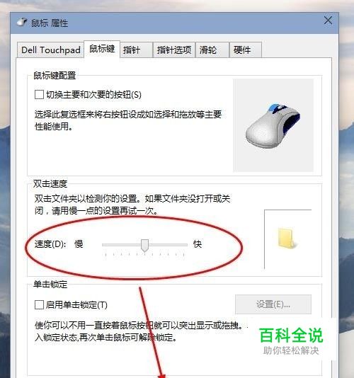 这样就打开了鼠标属性对话框。点击【鼠标键】,可以通过滑动双击速度中的游标来调整鼠标双击速度。