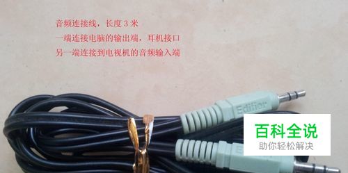 用音频线连接电脑与电视机。 电脑接到音频输出端,音频线另一端连接电视机的音频输入端
