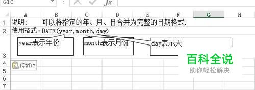 然后,在如图所示的结果处输入=date(year,month,day)。