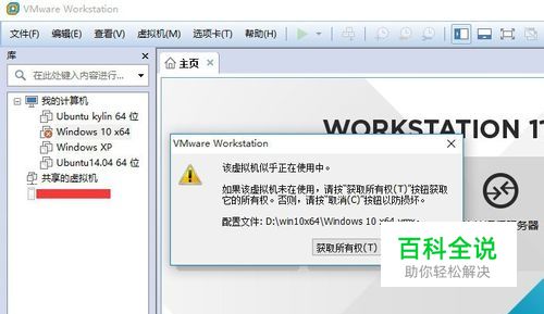 在用VMware虚拟机的时候,有时会发现打开虚拟机时提示“该虚拟机似乎正在使用中。如果该虚拟机未在使用,请按“获取所有权(T)”按钮获取它的所有权。否则,请按“取消(C)”按钮以防损坏。配置文件: D:\win10x64\Windows 10 x64.vmx。”这是由于虚拟机未正常关闭引起的,下面看看解决办法。