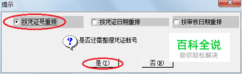 在如图“提示”对话框中选择“按凭证号重排”后点击“是”。系统便完成了对凭证号的重新整理。